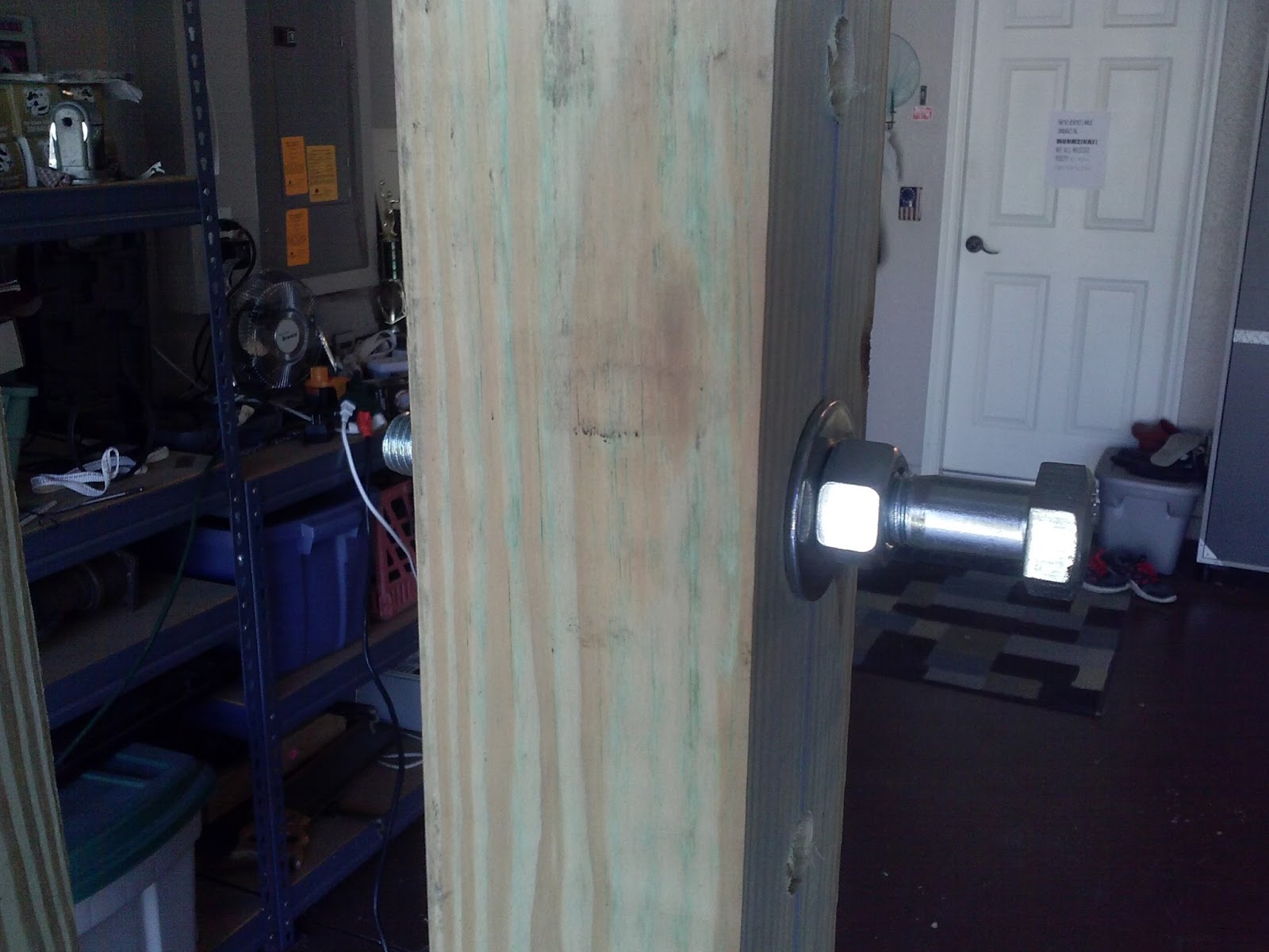 On the two middle posts we drilled 6 additional holes starting above the last hole (again every 4 inches) using a 7/8" bit. These holes are for the bolt to set the bar on. See the six smaller holes?